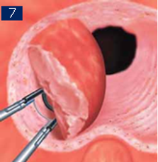 Rotate the spatula 90° and then enucleate the median lobe at the bladder neck laterally along the round of the internal urethral orifice. Incise the remaining mucosa with arc discharge of a TUEB electrode. The entire median lobe is pushed into the bladder, leave them until 8 is performed.